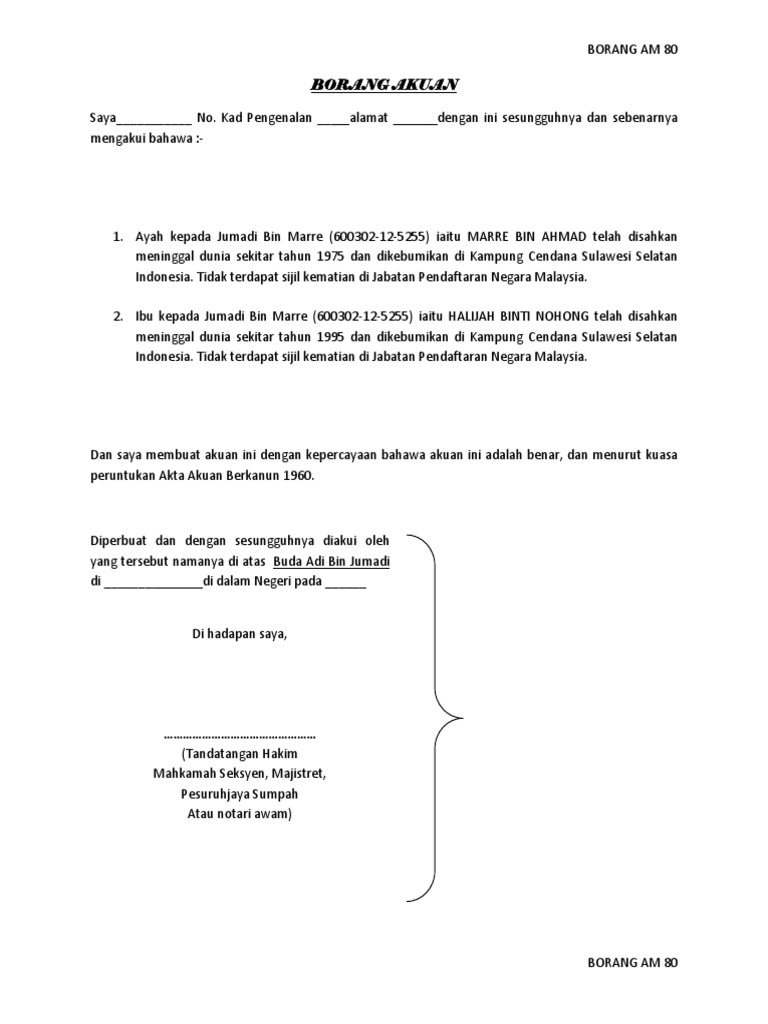 BORANG AM 80 BORANG AKUAN SayaNo Kad Pengenalan Yang beralamat di. Bahagian Khidmat Pengurusan. Sekiranya pihak insuran jabatan atau kementerian memberikan anda format surat akuan yang salah sila berikan link kepada video ini untuk mereka fahami bahawa pesuruh jaya sumpah tidak boleh mengesahkan surat akuan yang tidak ikut format.