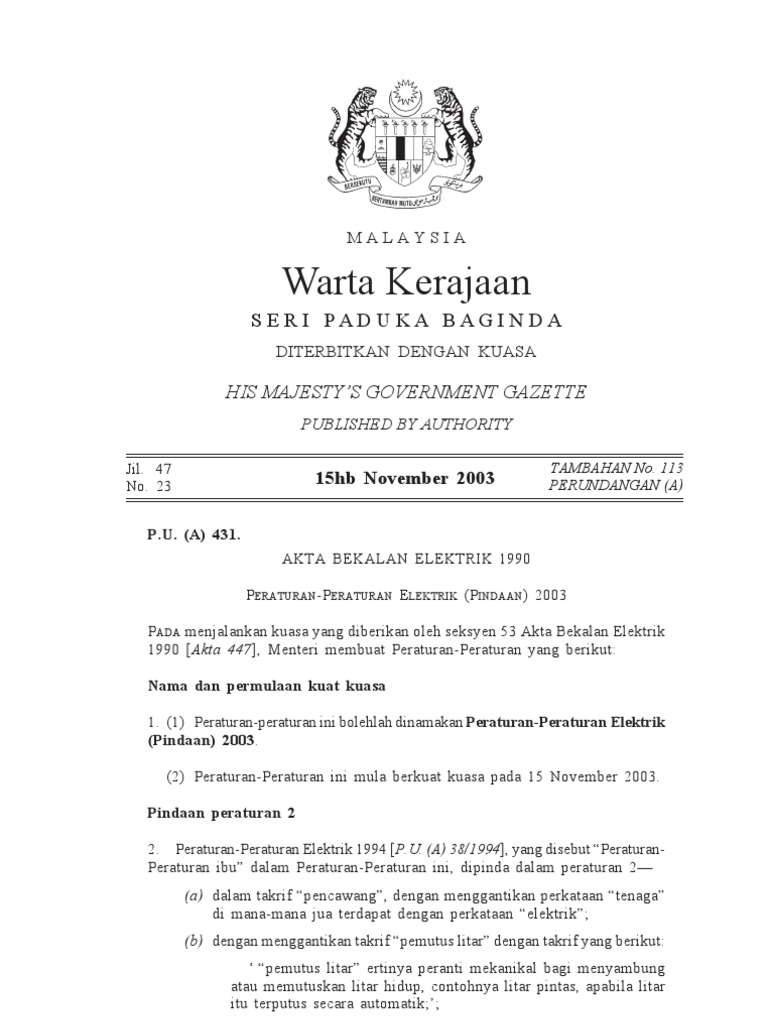 Akta Bekalan Elektrik Pindaan P U A 431 2003 Bm Bi 0 Pdf