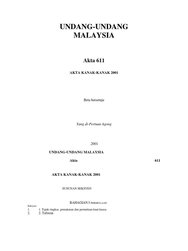 Check spelling or type a new query. Undang-Undang Malaysia Cetakan Semula akta 611 akta kanak-kanak 2001 Mengandungi segala pindaan hingga 1 Januari 2006 Diterbitkan oleh PeSuruhjaya Penyemak unDang-unDang malaySia Di bawah kuaSa akta Penyemakan unDang-unDang 1968 SeCara uSaha Sama Dengan PerCetakan naSional malaySia bhD 2006. BORANG YANG BERKAITAN.
