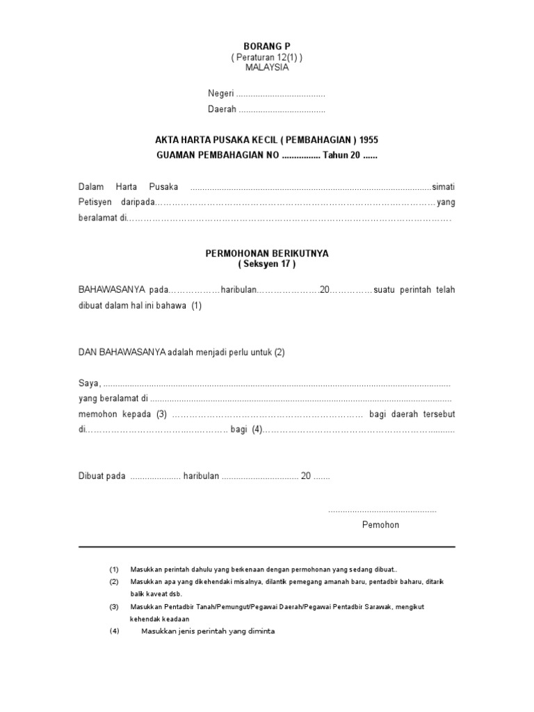 Borang p pusaka kecil. BORANG P Peraturan 12 1 MALAYSIA Negeri JOHOR Daerah _____ AKTA HARTA PUSAKA KECIL PEMBAHAGIAN 1955 GUAMAN PEMBAHAGIAN NO TAHUN 2019 Dalam Hal Harta Pusaka MD RAMLI BIN AHMAD NOKP101024-04-50550202586 si matiPetisyen daripada KAMISAH BINTI MOHAMED NO KP. Saya memohon supaya harta pusaka si mati itu dibahagi-bahagikan mengikut cara yang diperuntukkan dalam Bahagian II Ordinance Pembahagian Harta Pusaka Kecil 1955. BORANG P Subperaturan 121 MALAYSIA Negeri Daerah.